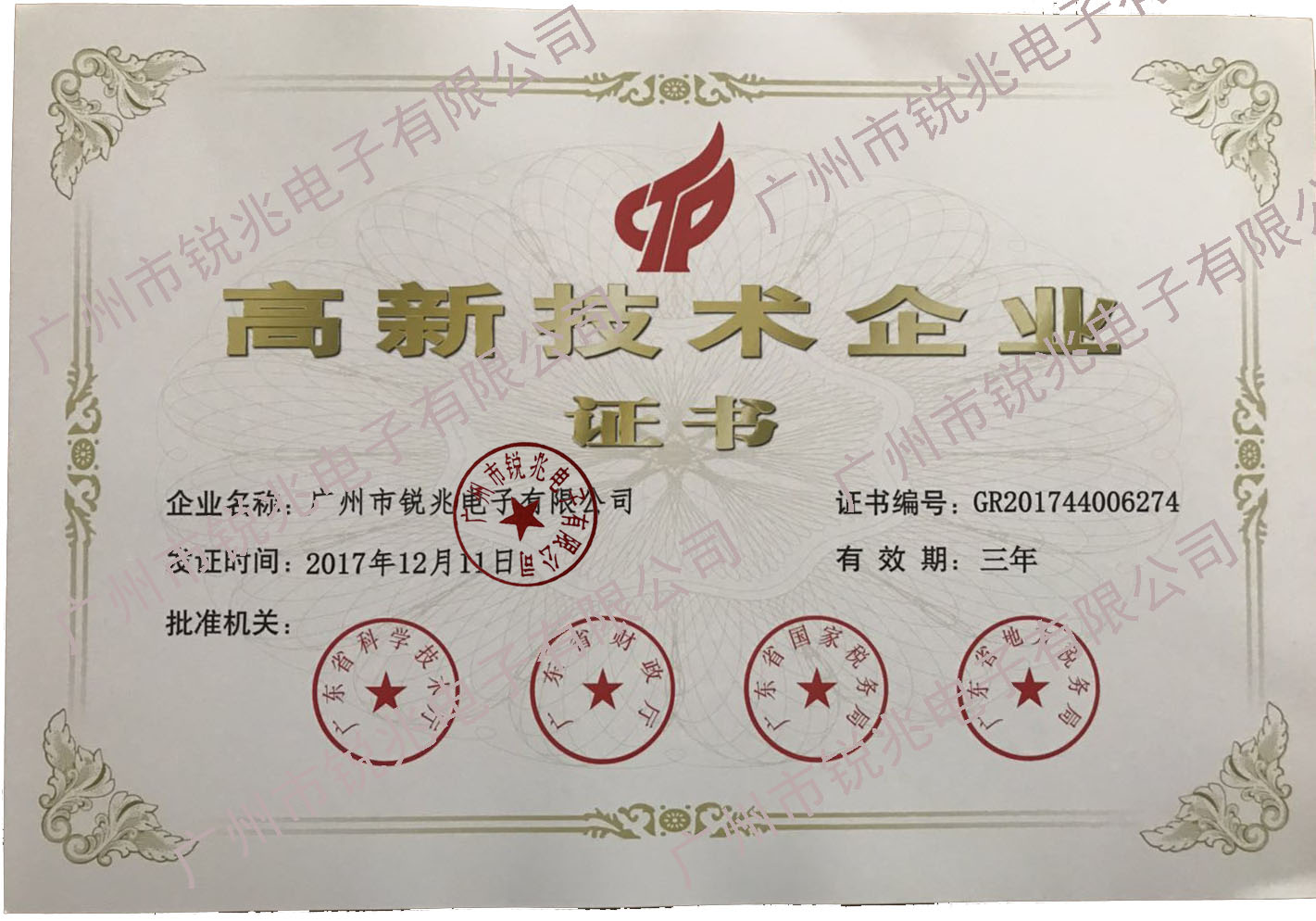 廣州市銳兆電子有限公司榮獲廣東省高新技術企業